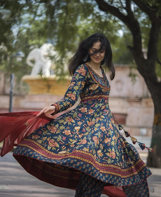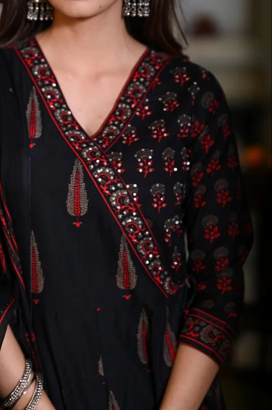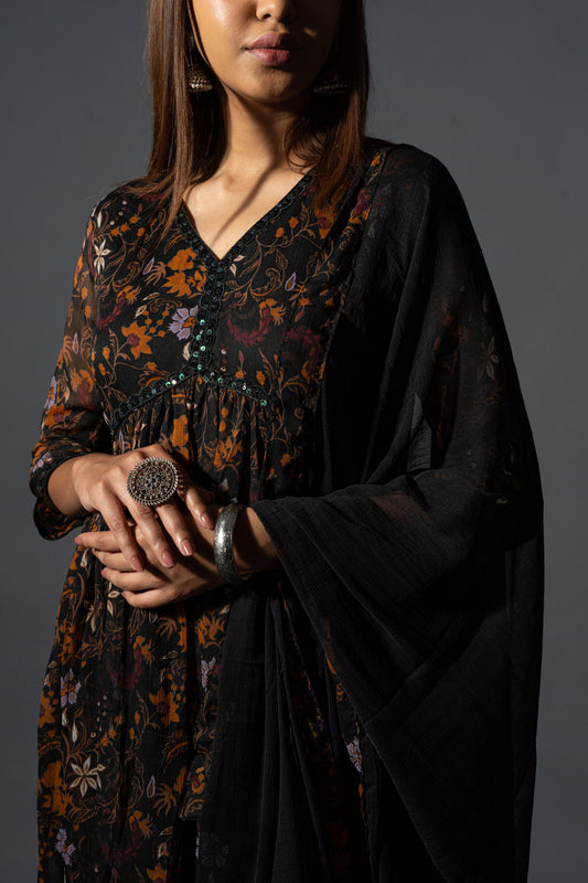 Floral Printed Beads & Embroidered Flared Kurta with Pants & Dupatta - Black (Set of 3)