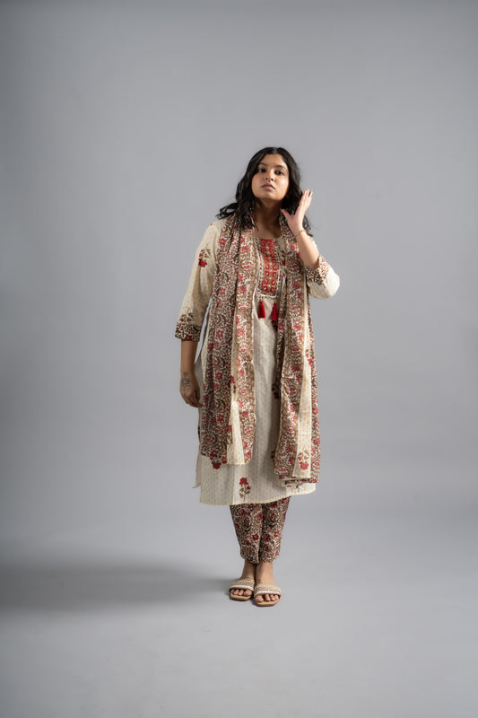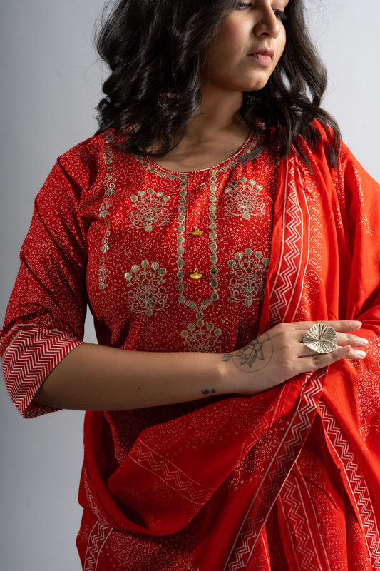 Tomato Red Cotton Printed Kurta pants with Dupatta (Set of 3)