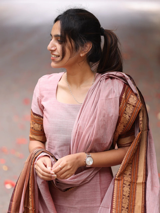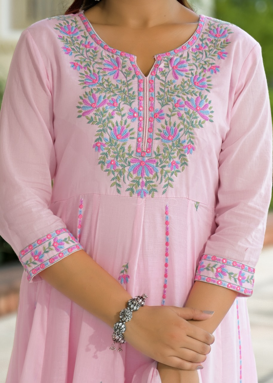 Pink Solid Cotton Rayon Kurta & Pants With Organza Dupatta