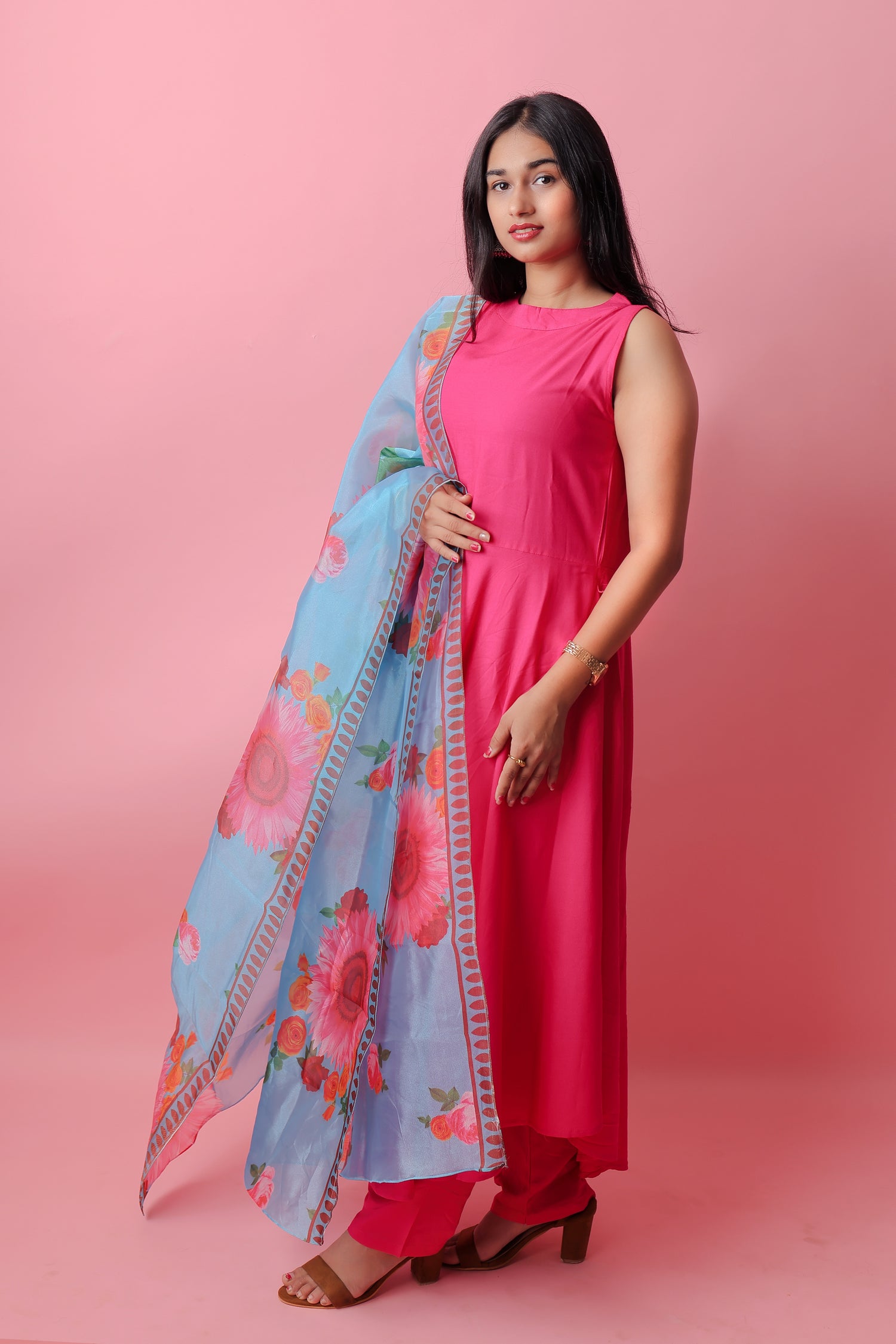 Pink Solid Cotton Rayon Kurta & Pants With Organza Dupatta