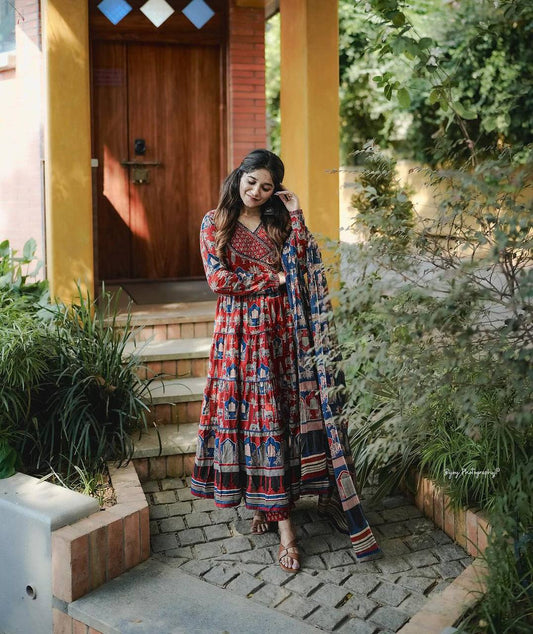Cotton Ajrakh Anarkali Suit With Palazzo & Dupatta