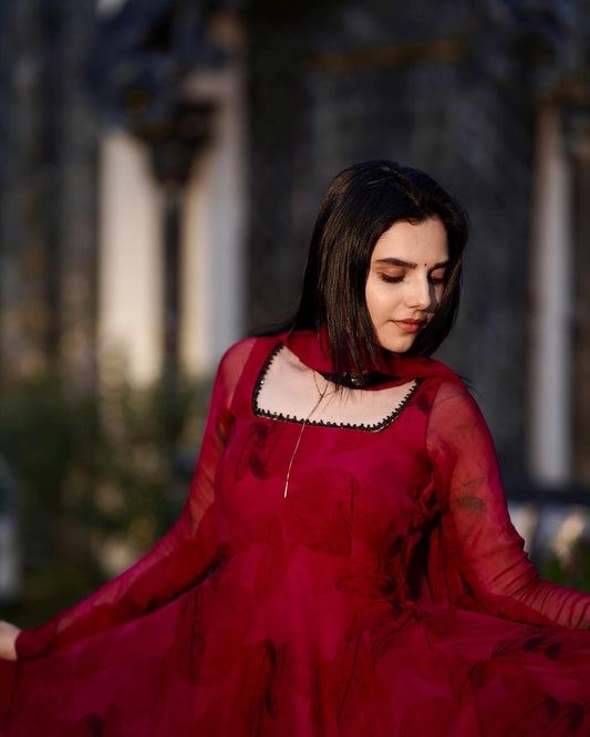 Crimson Mul Chanderi Thread Embroidered Anarkali Suit Set