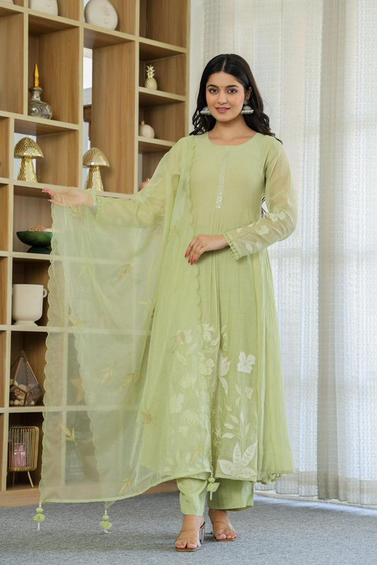 Olive Crush Chanderi Embroidered Applique Work Suit Set