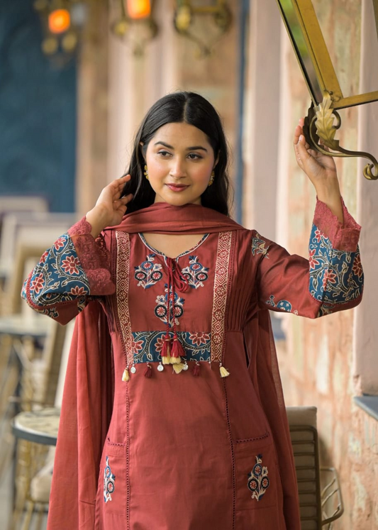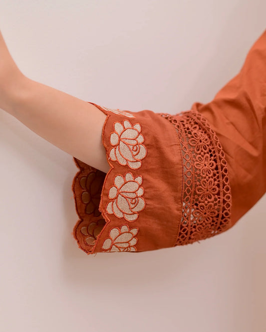 Rust Orange Green Embroidered Cotton Kurta Suit Set
