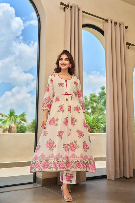 Mul cotton Floral Embroidered A Line Kurta Suit