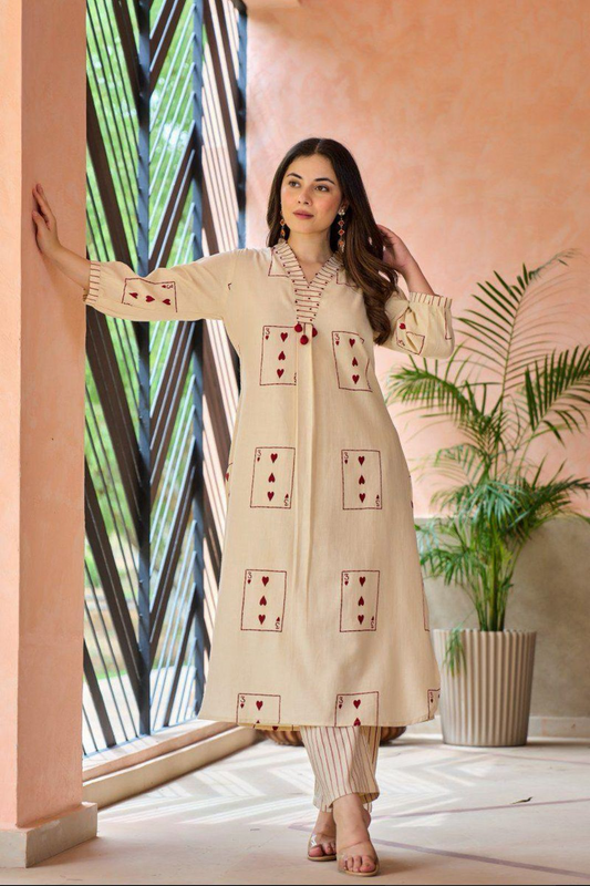 Red Cotton Embroiderd Pintex Kurta Pant Set