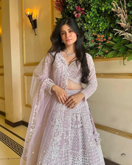 Lavender Hand-embroidered On Tissue Fabric With Crystals, Cutdana, Sequin, Thread, Beads Detailing Lehenga
