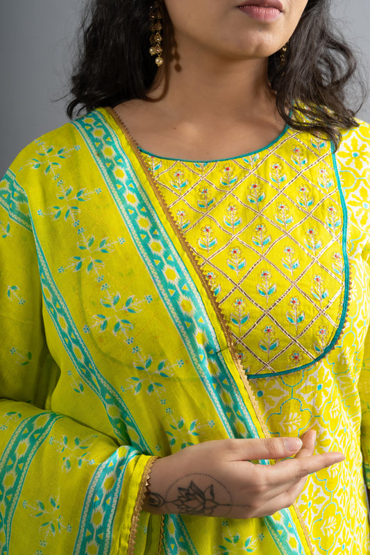 Neon Yellow Cotton Printed Kurta pants with Dupatta (Set of 3)