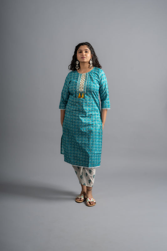 Turquoise Blue Cotton Printed Kurta pants with Dupatta (Set of 3)