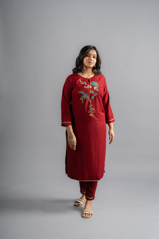 Cotton Amber Red Embroidered Kurta pants with Dupatta (Set of 3)
