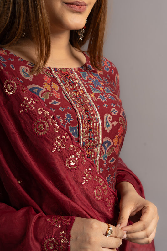 Maroon Cotton Printed Kurta pants with Dupatta (Set of 3)