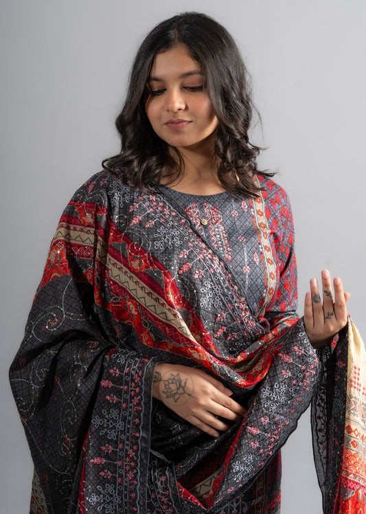 Dark Grey Cotton Embroidered Kurta pants with Dupatta (Set of 3)