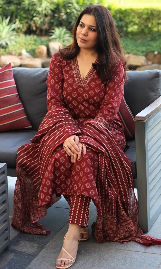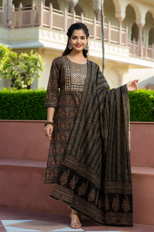 Cotton Ajrakh Printed Sequence Adda & Embroidered Kurta Pant & Dupatta
