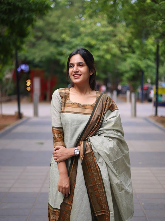 South Cotton Handloom Zari Self Thread Kurti Pant & Dupatta