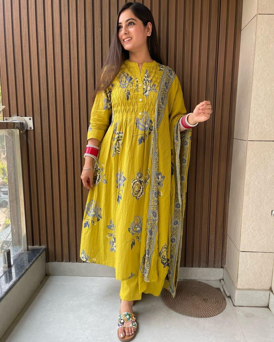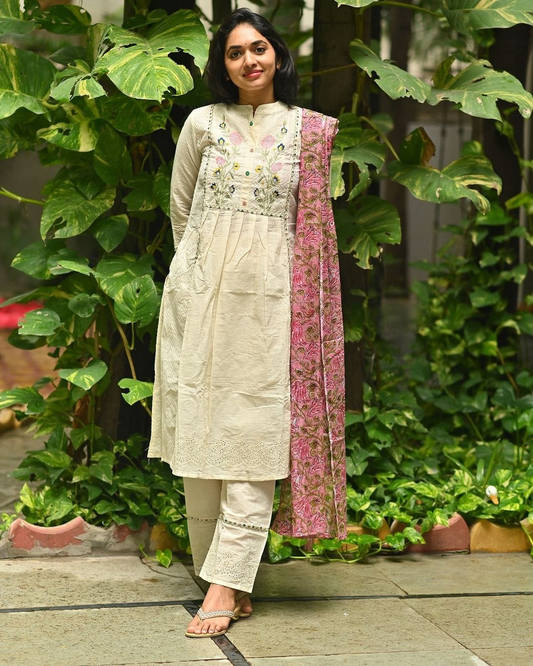 Cotton Floral Embroidered A Line Kurta Pant & Dupatta