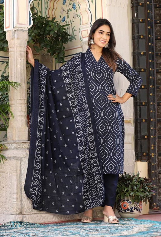 Cotton Bandhej Printed Hand & Lace Work Kurti Pant & Dupatta