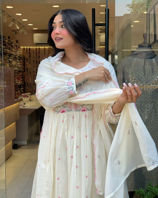 Mul cotton Floral Embroidered A Line Kurta Suit