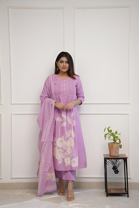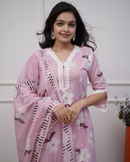 Beautiful Cotton Floral Printed Kurta Pant & Dupatta Set (2 Colors)