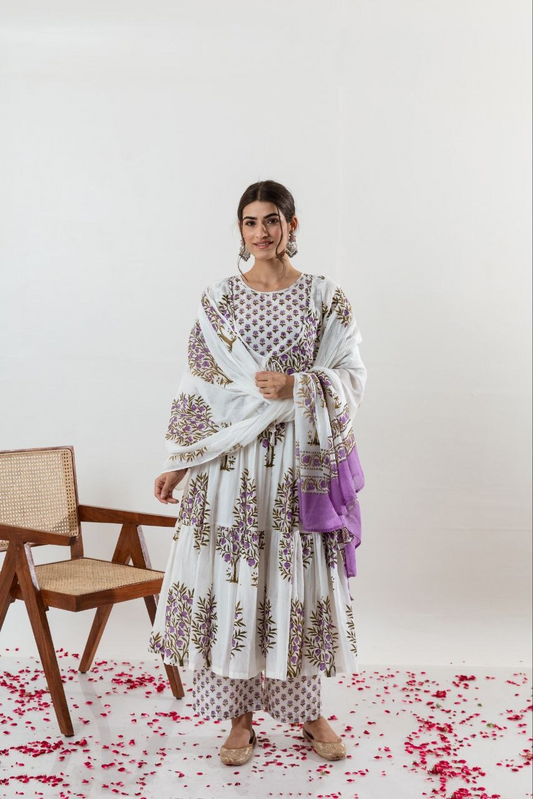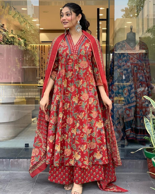 Cotton Floral Block Printed Kurta Palazzo & Dupatta (4 Colors)