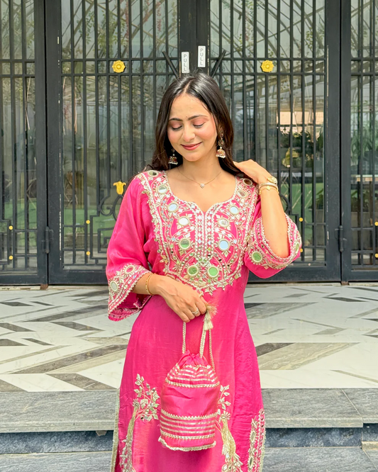 Pink Roman Silk Mirror Work Kurta & Sharara