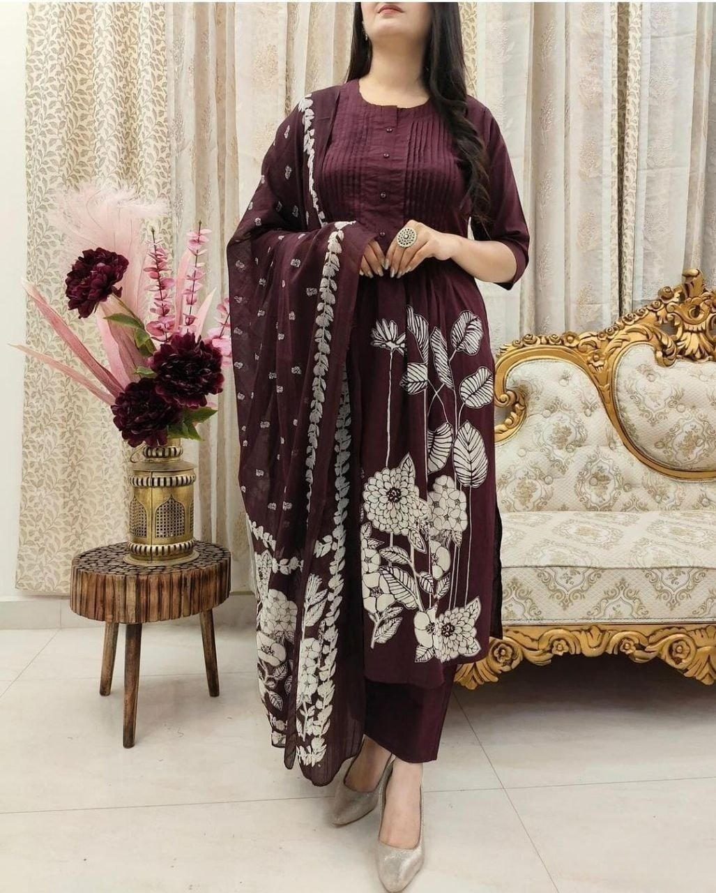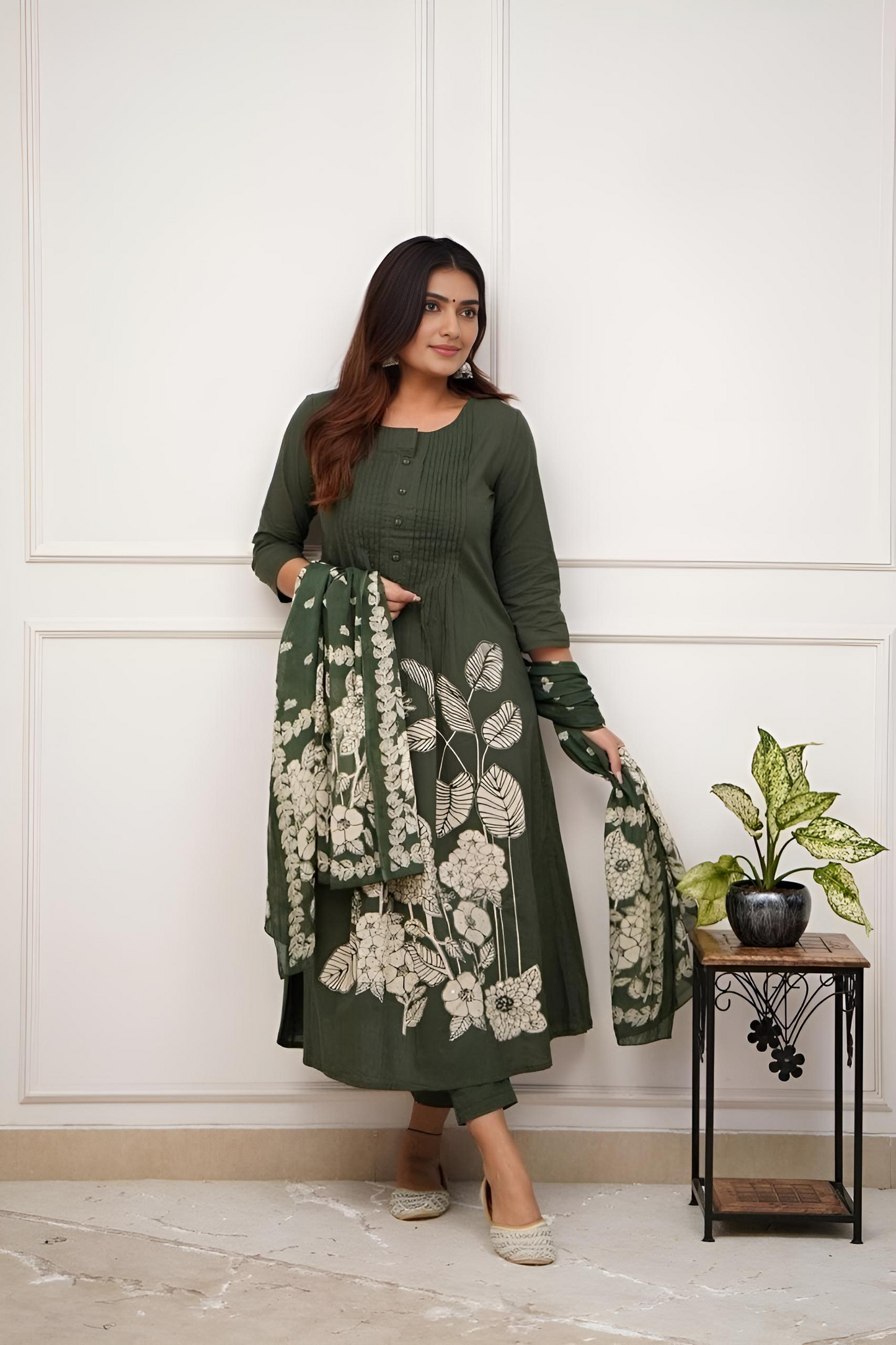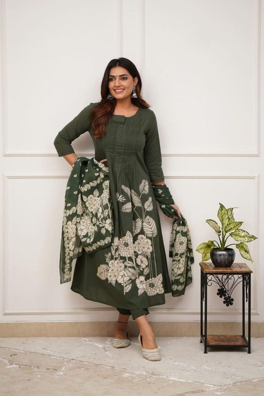 Beautiful Cotton Floral Printed Kurta Pant & Dupatta Set (2 Colors)