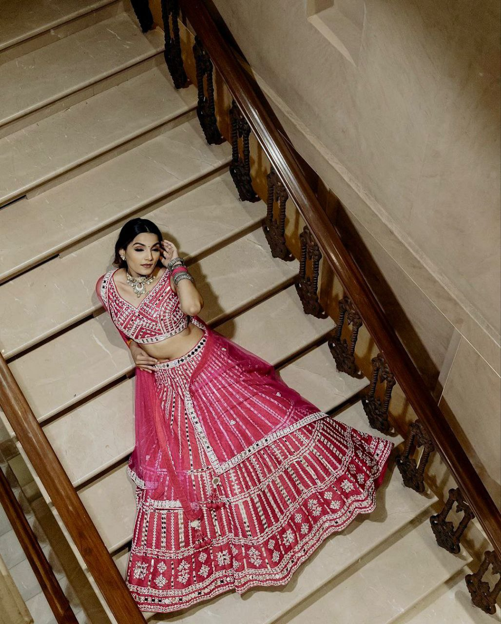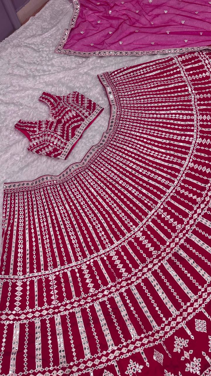 • Heavy slub silk lehenga with thread & paper mirror work
