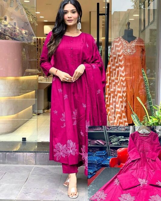 Beautiful Cotton Floral Printed Kurta Pant & Dupatta Set (2 Colors)