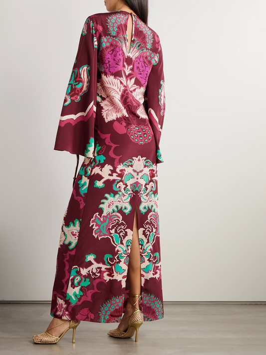 Long Printed Smooth Satin Dress With Front Slit