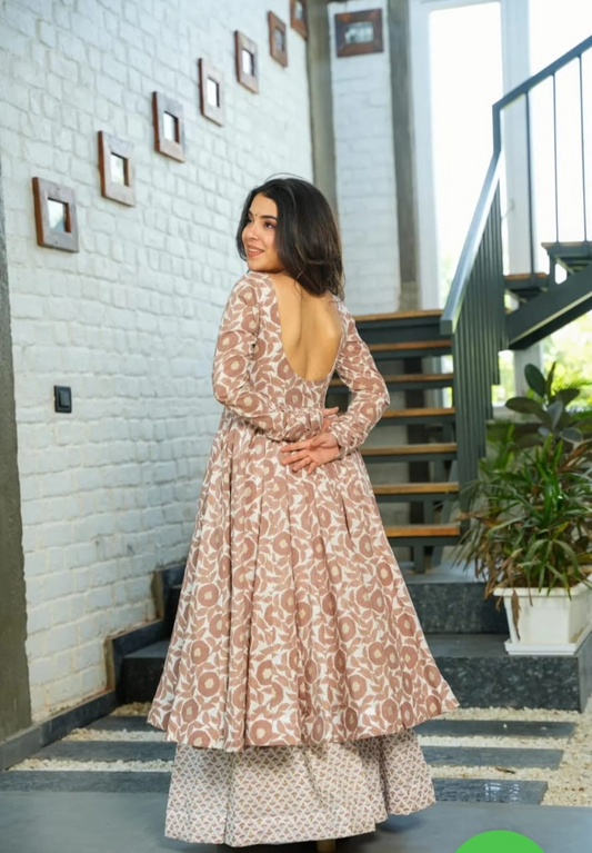 Brown Cotton Printed Embroideried Anarkalli Suit