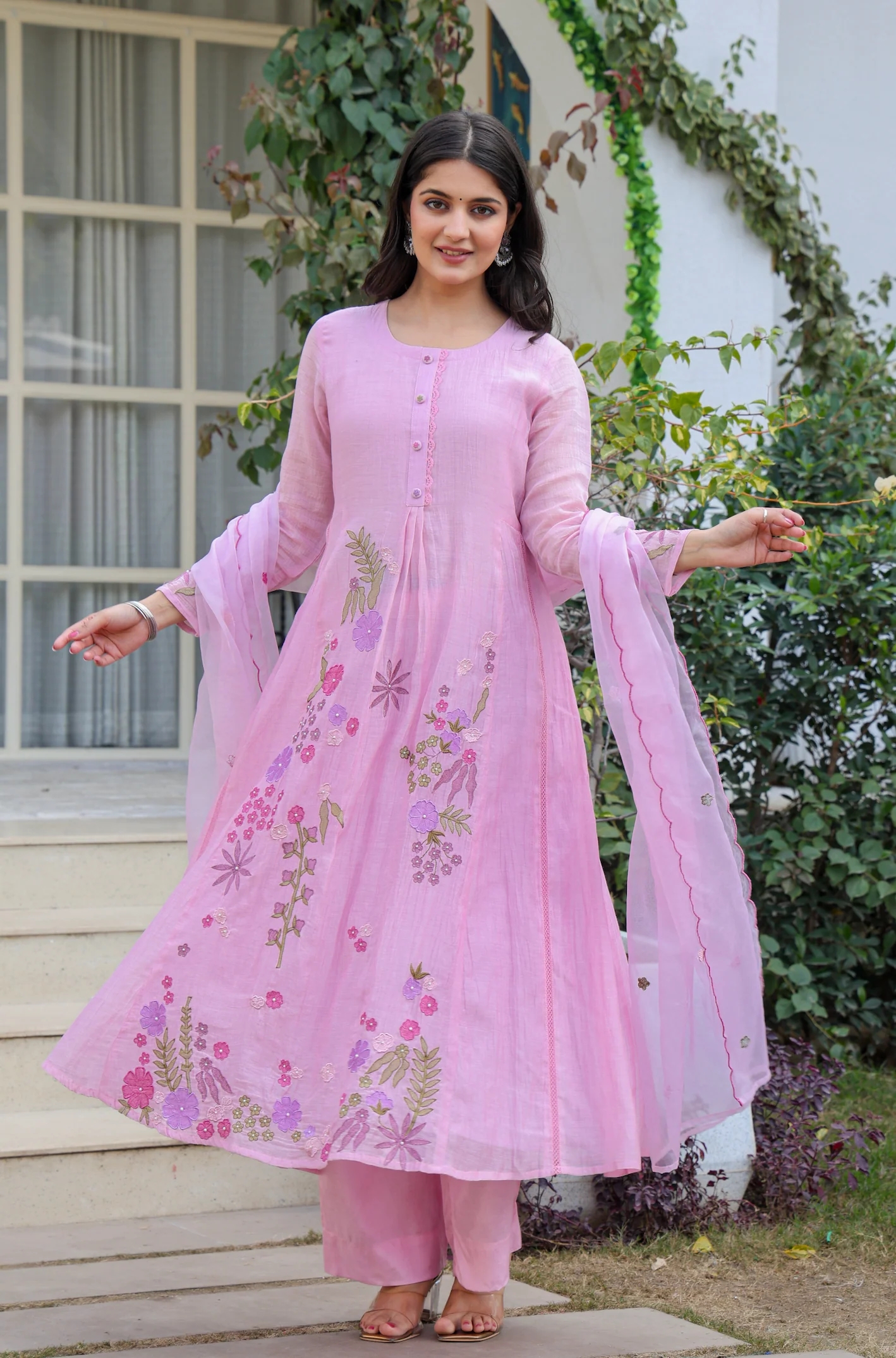 Mul Chenderi Embroidered Applic Work Kurta Pant & Dupatta (2 Colors)