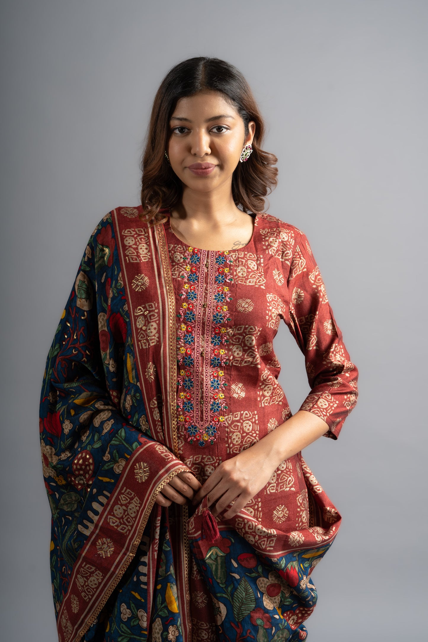 Brown Silk Printed Kurta pants with Blue Dupatta (Set of 3)